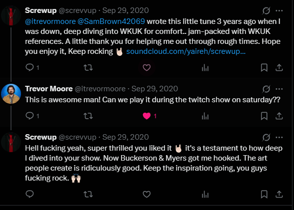 Cut to 2020, I’m post surgery, wheelchair bound in a neurology B at Tel Hashomer when I discover that Trevor is gathering the gang to start streaming on Twitch. Twice a week (at least) between midnight and 1 am, I would watch them run gags, watching their old sketches, once or twice they even accidentally improvised a sketch live (google “bet you can’t get me”). They even started role-playing and it was incredibly chaotic. Trevor even responded to me on Twitter once about a tribute song to WKUK that I recorded a sketch for.